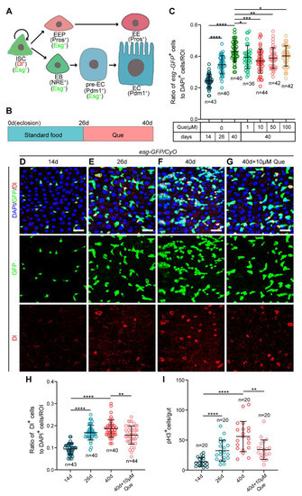 Drosophila melanogaster is a well-established model system for studying developmental biology and aging because it possesses the advantages of abundant genetic resources, simple operation, and high similarity with mammalian tissues [24,25]. Over the past decades, the discovery of the intestinal stem cell lineage in the Drosophila gut has made it an excellent model for adult stem cell research [4]. The Drosophila midgut epithelium comprises several types of cells: intestinal stem cells (ISCs) identified by expressing Delta (Dl, a ligand for the Notch receptor) and Escargot (Esg, a SNAIL family transcription factor); progenitor cells, including enteroblasts (EBs) and enteroendocrine progenitor cells (EEPs); and differentiated cells including enterocytes (ECs) and enteroendocrine cells (EEs). Notably, ISCs are mostly quiescent during intestinal homeostasis, but when the Drosophila midgut is stimulated, they divide to self-renew and generate EBs or EEPs. Subsequently, EBs with high Notch signaling differentiate into ECs, whereas EEPs differentiate into EEs (Figure 1A) [4,5,26,27]. Accumulating evidence has revealed that signaling pathways, such as insulin [28,29,30], ROS [31,32], and JNK [33], control the division and differentiation of ISCs and maintain intestinal homeostasis. Studies have also shown that the uncontrolled proliferation of ISCs in the aged Drosophila intestine leads to the accumulation of ISCs and progenitor cells (EBs and EEPs), ultimately disrupting intestinal homeostasis and impairing intestinal function [32,33]. Interestingly, the decreased proliferative activity of ISCs in the aged Drosophila intestine correlates with extended lifespan and maintenance of intestinal homeostasis [28,34]. Therefore, considering the above, we chose the Drosophila midgut as the preferred model tissue for studying the effect and mechanism of Que on ISC aging.