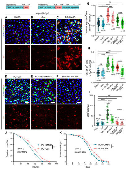 Que prevents stimulus-induced hyperproliferation of ISCs and improves stress tolerance in Drosophila. (A–F) Representative immunofluorescence images of Drosophila posterior midguts stained with DAPI, GFP, and Dl for DMSO (A), Que (B), PQ + DMSO (C), PQ + Que (D), BLM-rec-2d + DMSO (E), and BLM-rec-2d + Que (F) groups. The 0-day-old flies were fed with 10 µM Que for 10 days, then treated with 10 mM PQ for 1 day, followed by dissection. The 0-day-old flies were fed with 10 µM Que for 10 days, then treated with 25 µg/mL BLM for 1 day, and then resumed feeding with 10 µm Que for 1/2/3 days, followed by dissection. The top panels represent the merged images, whereas the bottom panels represent Dl. Scale bars represent 25 µm. (G,H) The ratio of esg-GFP+ cells (G) and Dl+ cells (H) to DAPI+ cells per ROI in the posterior midguts of flies in experiments (A–F). n: number of ROI counted. (I) The number of pH3+ cells in the whole gut of flies in experiments (A–F). n: number of gut counted. (J,K) Survival percentage of female W1118 flies with DMSO (blue curve) or Que (pink curve) supplementation under 20 mM PQ (J) or 5 µg/mL BLM (K) treatments. Each group had 100 flies and three independent experiments were conducted. Error bars represent SDs. Log-rank test was used for lifespan analysis. Student’s t-tests, * p < 0.05, ** p < 0.01, *** p < 0.001, **** p < 0.0001, and non-significance (ns) represents p > 0.05.