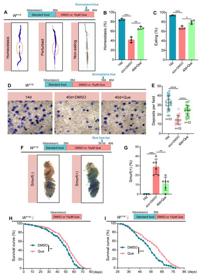 Que prevents age-related gut dysfunction and prolongs the lifespan. (A) Representative images of the intestinal acid-base homeostasis and the non-eating intestine of 14- and 40-day-old flies without Que supplementation and 40-day-old flies with 10 µM Que supplementation. A pink ellipse indicates the CCR. “Homeostasis” refers to CCR as yellow and “Perturbed” refers to CCR as blue. “Non-eating” means the flies did not eat, and the guts are not stained with bromophenol blue. (B,C) The percentage of acid-base balanced intestines (B) and eating intestines (C) in experiment (A). N ≥ 50 flies per group. Three independent experiments were conducted. (D,E) Representative images (D) and quantification (E) of excretion deposits of 14-and 40-day-old flies without Que supplementation and 40-day-old flies with 10 µM Que supplementation. Each group included 30 flies and three independent experiments were conducted. n: number of field counted. (F,G) Representative images (F) and quantification (G) of the percentage of the smurf flies in 14- and 40-day-old flies without Que supplementation and 40-day-old flies with 10 µM Que supplementation. Smurf (+) refers to a fly that leaks the blue dye from the gut into other tissues. Each group included 15 flies and three independent experiments were conducted. (H,I) Survival percentage of female W1118 flies with DMSO (blue curve) or Que (pink curve) supplementation starting from eclosion (0-day-old) or middle age (26-day-old). Each group included 100 flies. Three independent experiments were conducted. Error bars represent SDs. Log-rank test was used for lifespan analysis. Student’s t-tests, * p < 0.05, ** p < 0.01, *** p < 0.001, and **** p < 0.0001.