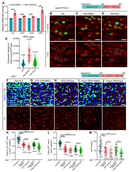Accumulating evidence suggests that Que can prevent and treat various diseases, in which its antioxidant activity plays a significant role [48]. In addition, studies have demonstrated that elevated ROS increases the proliferation of ISCs, thereby leading to gut dysplasia in aged Drosophila [49,50]. Herein, real-time quantitative PCR (RT-qPCR) analyses were performed to explore whether Que promotes the homeostasis maintenance of ISCs via its antioxidant capacity. Results revealed that the expression of antioxidant-related genes (Cat, Sod1, Sod2, and GstD1) was elevated in the Que-fed aged flies, but not in young flies (Figure 4A and Figure S3A), indicating that Que has an aging-specific effect to scavenge ROS. Meanwhile, we directly characterized the ROS levels in esg-GFP+ cells using the fluorescent probe DHE, which exhibits increased fluorescence intensity upon oxidation [32]. Results showed that the intensity of DHE fluorescence was significantly elevated in the esg-GFP+ cells of aged flies, whereas aged flies subjected to Que feeding showed a significantly reduced DHE activity (Figure 4B–E).