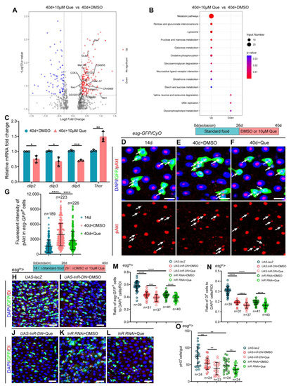 To further explore the underlying mechanism through which Que maintains ISC homeostasis in aged flies, we performed RNA-sequencing of the midguts of old flies fed with and without Que. Results showed that antioxidant-related genes (Glaz, Karl, and foxo) were significantly upregulated in the midguts of aged Drosophila fed on a diet supplemented with Que (Figure 5A), which was consistent with the above results (Figure 4A). In addition, it was found that some genes associated with glucose and lipid metabolism were upregulated in aged Drosophila fed with Que (Figure 5A). Moreover, the KEGG enrichment analysis of differentially expressed genes revealed that the genes involved in metabolic pathways were significantly enriched (Figure 5B). Considering that the insulin/insulin-like growth factor signaling (IIS) pathway is the primary pathway that regulates energy metabolism, and previous studies have demonstrated that the IIS pathway plays an essential role in lifespan regulation [51,52], we speculated that Que might maintain the homeostasis of ISCs through regulating the insulin signaling pathway. To test this hypothesis, RT-qPCR was performed using sorted esg+ cells to determine the expression of insulin signaling pathway-related genes in ISCs. Results revealed decreased expression of dilp2, dilp3, and dilp5 (Drosophila insulin-like peptide 2, 3, and 5, which negatively regulate lifespan [53]), and increased expression of Thor (also known as 4EBP) in aged flies fed with Que (Figure 5C), but not in young flies (Figure S4A), suggesting that Que regulates the insulin signaling pathway. Besides, we directly measured the activity of the insulin signaling pathway by evaluating the expression of phosphorylated Akt (p Akt). It was found that the fluorescence intensity of pAkt was significantly elevated in aged esg-GFP+ cells (Figure 5D,E,G). However, old flies subjected to Que supplementation showed a significantly reduced pAkt expression (Figure 5F,G), which indicated attenuated insulin signaling activity. To further verify the effect of Que on the insulin signaling pathway, we inhibited the pathway by expressing a dominant negative (DN) form of InR (insulin-like receptor) or expressing dsRNA for RNAi of InR (the RNAi-mediated knockdown efficiency is shown in Figure S4B), in which the numbers of esg-GFP+, Dl+, and pH3+ cells were fewer than in the control group (Figure 5H,I,K,M–O). Results revealed that Que supplementation could further reduce the number of esg-GFP+, Dl+, and pH3+ cells in aged flies (Figure 5J,L,M–O), probably due to its additional antioxidant capacity. Altogether, these findings suggest that Que contributes to the homeostasis maintenance of ISCs in aged Drosophila, in part, by inhibiting the insulin signaling pathway.