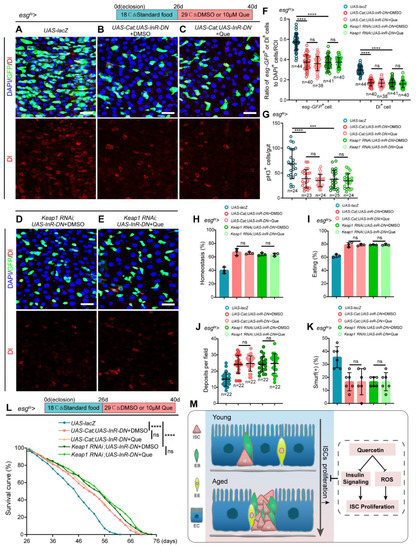 To evaluate whether Que prevents the age-related functional decline of ISCs by scavenging ROS and inhibiting insulin signaling pathway, we constructed two Drosophila strains: esgts-Gal4-driven Cat overexpression and InR-DN overexpression and esgts-Gal4-driven Keap1 depletion and InR-DN overexpression. Results revealed a significant reduction of esg-GFP+, Dl+, and pH3+ cells in these flies compared to the normal aged flies (Figure 6A,B,D,F,G), and Que supplementation could not further enhance these effects (Figure 6C,E–G). In addition, there were no significant differences in intestinal acid-base homeostasis, the function of food ingestion and excretion of waste products, and the intestinal barrier between Que-fed and non-Que-fed aged flies (Figure 6H–K). Furthermore, Que supplementation could not further extend the lifespan (Figure 6L). These results suggest that Que prevents the age-associated functional decline of ISCs via scavenging ROS and inhibiting the insulin signaling pathway (Figure 6M).
