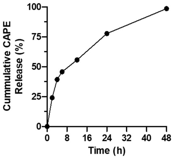 The in vitro release profile of CAPE from the prepared formula in a pH 6.8 phosphate buffer is shown in Figure 2. The release of CAPE was obviously sustained for 48 h. A slight burst release was observed at 2 h, amounting to 24.1 ± 1.8%. This was followed by sustained release of CAPE that reached a cumulative value of 77.8 ± 7.9% and 98.6 ± 10.7% at 24 and 48 h, respectively.