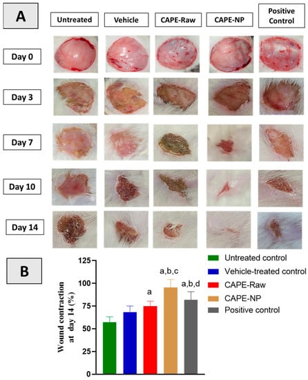 (A) Effects of CAPE-NPs on wound healing and % wound contraction on days 0,3,7,10, and 14. (B) Graphic presentation of wound contraction at day 14.Data are expressed as mean (n = 6) ± SD. (a) Significantly different from untreated control at p < 0.05, (b) significantly different from vehicle-treated control at p < 0.05, (c) significantly different from CAPE-raw at p < 0.05, and (d) significantly different from CAPE-NP at p < 0.05.
