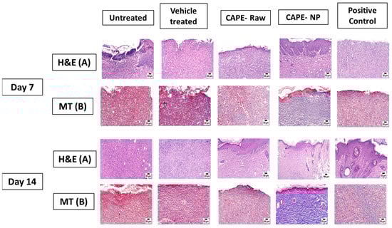 As shown in Figure 3A, the untreated group and vehicle-treated group, CAPE-raw formulation, CAPE-NP formulation, and positive control formulation had open wounds on day 0. However, on days 3, 7, 10, and 14, the topical application of the CAPE-NPs exhibited an obvious and significant enhancement in wound contraction followed by the marketed formulation (positive control) and CAPE-raw formulation. It is noteworthy that the diabetic rats treated with the CAPE-NPs exhibited a wound contradiction of 97% on day 14 (Figure 3B).