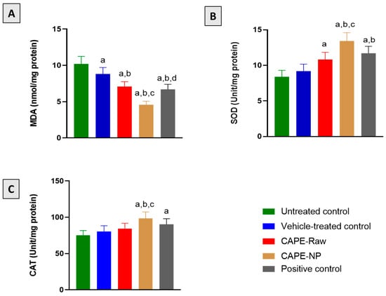 Effects of CAPE-NPs on oxidative status markers (A) MDA, (B) SOD, and (C) CAT. Data are expressed as mean (n = 6) ± SD. (a) Significantly different from untreated control at p < 0.05, (b) significantly different from vehicle-treated control at p < 0.05, (c) significantly different from CAPE-raw at p < 0 .05, and (d) significantly different from CAPE-NP at p < 0.05.
