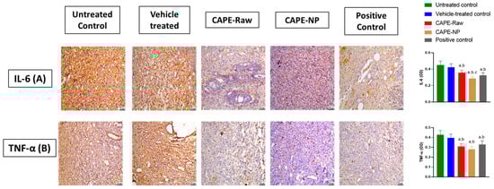 Effects of CAPE-NPs on the expression of (A) IL-6 and (B) TNF-α. Data are expressed as mean (n = 6) ± SD. (a) Significantly different from untreated control at p < 0.05, (b) significantly different from vehicle-treated control at p < 0.05, and (c) significantly different from CAPE-raw at p < 0 .05.