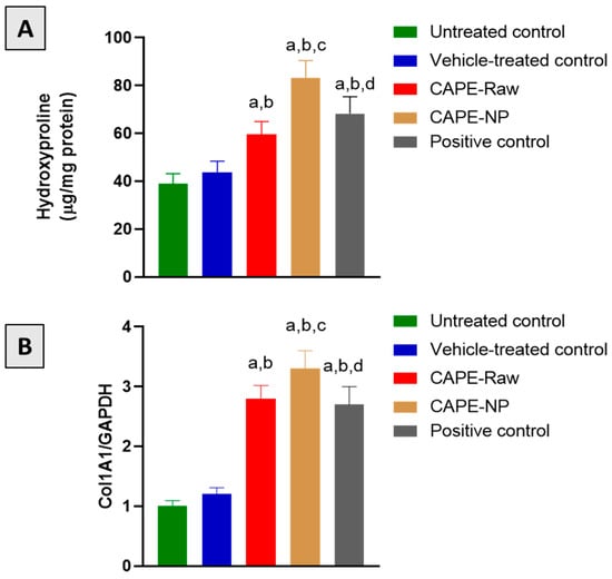The application of the CAPE-raw or CAPE-NPs formulations significantly increased the hydroxyproline content by 51.3% and 113.6%, respectively, as compared with the untreated group (Figure 7A). Likewise, both preparations significantly up-regulated the mRNA of Col1A1 by 180% and 230%, respectively, as compared with the untreated animals (Figure 7B).