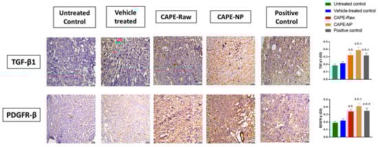 As depicted in Figure 8, the treatment of diabetic rats with CAP-NPs significantly enhanced TGF-β1 expression in comparison with the untreated, vehicle-treated, and CAPE-raw groups, by 110.8, 81.4, and 22.0%, respectively. In addition, PDGFR-β was significantly enhanced by the application of CAP-NPs by 115.8%, as compared with untreated animals. It is noteworthy to report that the CAPE-NP group was superior to the positive control group in enhancing PDGFR-β expression by 20.0%.