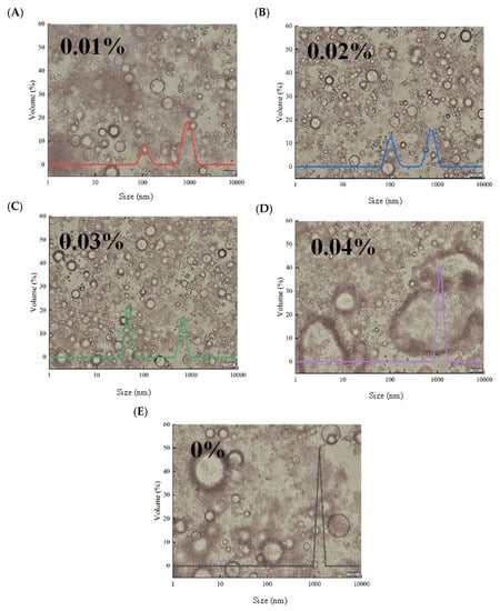Changes in droplet size distribution and optical micrograph of wooden breast myofibrillar protein emulsion with different (-)-epigallocatechin-3-gallate addition (A–E). Note: intermediate peak A (around 100 nm), intermediate peak B (around 1000 nm).