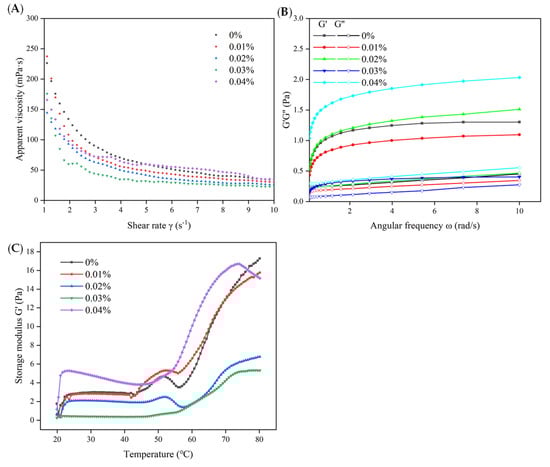 Using a DHR-1 hybrid rheometer (MCR302, Anton Paar, Austria) equipped with a parallel plate (60 mm in diameter and 1 mm in thickness) connected to a cooling system (Thermo Cube, New York, NY, USA). The flow behavior of the samples was determined using tests by Zhao, Wang, Zou, Li, Kang, Xu and Zhou [21]. The apparent viscosity was determined in the shear rate range of 0.1–1000.0 s−1 at 25 °C with a gap width of 1000 μm. The range of 1–10 s−1 was selected to ensure that any changes could clearly be observed. Additionally, we analyzed to determine the storage modulus (G′) and loss modulus (G″) as a function of the angular frequency (ω) in the range of 0.1–100.0 rad/s. The range of 1–10 rad/s was selected to ensure that any changes could clearly be observed. The G′ profile of the WBMP was measured while the temperature was increased from 20 °C to 80 °C at a heating rate of 1 °C/min (thermal gelation), and the G′ values were recorded continuously.