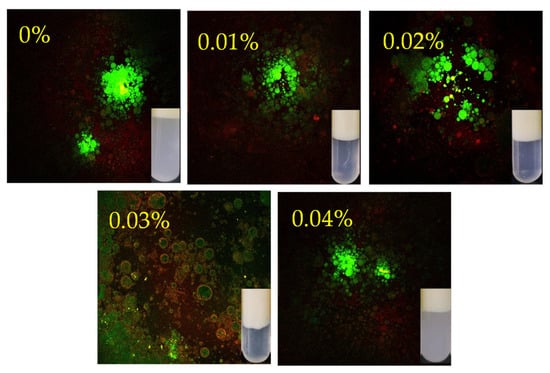 The oil is dyed green with Nile Red, and the protein is dyed red with Nile Blue (Figure 4). In the control group without EGCG, it can be found that large droplets are wrapped by an incomplete protein membrane, and many free protein masses are displayed. This is mainly because WBMP converged and cannot be dissolved, which makes it unable to migrate to the oil–water interface and form a membrane [16]. When EGCG was added, the droplet diameter began to decrease, and the protein distribution was more uniform. However, there were still some small and dense aggregates in the 0.01% and 0.02% groups. After the addition of 0.03% EGCG, the droplet diameter of the WBMP emulsion decreased, the protein film was wrapped tightly, and other proteins were evenly dispersed in the water phase. Similarly, when the EGCG was further increased to 0.04%, obvious local aggregation occurred. The formed structure was relatively loose and composed of droplets attracted by protein aggregates. The physical stability of the emulsion is dependent on the combination of EGCG and protein. However, excessive EGCG causes the aggregation of emulsion droplets owing to the location of the charged groups [16]. This confirmed the optical observations and the particle size results. We believe that the main reason for protein aggregation caused by a high concentration of EGCG is that 0.04% EGCG promotes the oxidation of WBMP, which is also reflected in the protein oxidation index we determined later. Therefore, the hydrophobic interaction and electrostatic interaction of proteins are also affected, and gradually, aggregation occurs. Among them, WBMP(control group) is a good example, because the WBMP particles become larger and aggregate due to protein oxidation. Additionally, a high concentration of EGCG counteracts the good effect of polyphenols on protein structure improvement, which promotes the aggregation of protein film-wrapped droplets in the emulsion. This research result is reflected in Tian, Kejing, Zhang, Yi, Zhu, Decker and McClements [16].