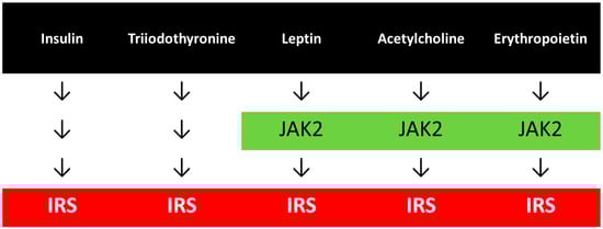 While insulin and triiodothyronine provide direct activation of the IRS, other hormones such as leptin, acetylcholine and erythropoietin, indirectly, through the stimulation of JAK2 exert the same IRS signalling (Figure 1), and other hormones may share this pathway as well. GLP-1 signalling is more complicated resulting in an activation of the Akt. The common criteria for the normal transduction of these hormonal signalings are the well-working essential tyrosine phosphorylation-dephosphorylation processes.