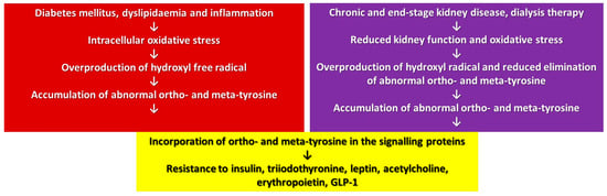 A posttranslational modification of proteins may change and, in some cases, derange their function. In our approach, a translational modification of proteins has a similar effect due to the overproduction or reduced elimination of abnormal tyrosines leading to their accumulation in the cellular proteins (Figure 2). This accumulation of abnormal tyrosines results in pronounced cellular changes if the signalling proteins are affected, since its consequences will be augmented by the signalling cascade producing a multi-hormonal resistance of the cells due to the overlapping signalling pathways of these hormones (Figure 2). The present review summarized the actually available data mainly related to obesity, diabetes, CKD and sepsis, but one may suppose that, in the case of any other origin of the oxidative stress, similar processes could take place.