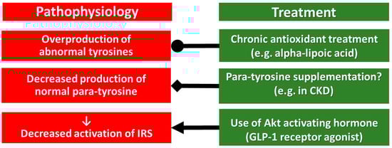 In a meta-analysis, the cardiovascular risk reduction by GLP-1 receptor agonists was between 9 and 16% [63], suggesting that their monotherapy is not effective enough, and for that reason, a triple combination of antioxidant, p-Tyr supplementation and GLP-1 receptor agonist may be preferred (Figure 3).