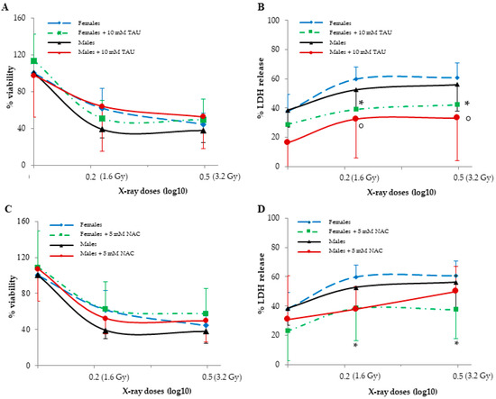 The effects of TAU and NAC pre-treatments on viability (A,C) and LDH release (B,D) in non-irradiated and irradiated female and male HUVECs. Data are reported as the means ± SD of 6–7 samples for each sex and dose. ° represents a p < 0.05 versus non-irradiated cells in MHUVECs, while * represents a p < 0.05 versus non-irradiated cells in FHUVECs.