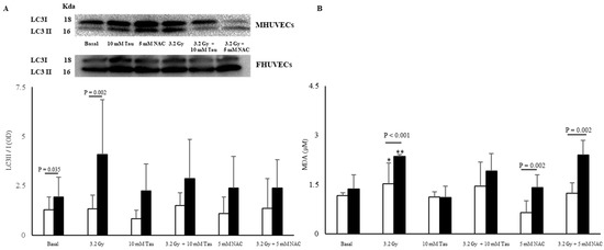 LC3II/I ratio (A) and MDA levels (B) in non-irradiated and irradiated MHUVECs (white bars) and FHUVECs (black bars) before and after pre-treatments. Data are reported as the means ± SD of at least 3 independent experiments. * p = 0.032 basal vs. 3.2 Gy in MHUVECs; ** p < 0.001 basal vs. 3.2 Gy in FHUVECs.