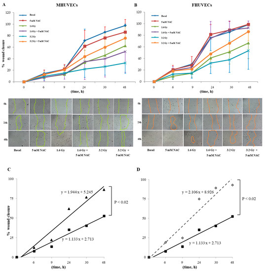 (A,B) The effect of 5 mM NAC on the migration of MHUVECs and FHUVECs. (C,D) Linear regression analysis of data illustrated in A e B on the migration of 1.6 Gy-irradiated pre-treated with NAC in MHUVECs (■) and FHUVECs (◊). (D) Linear regression analysis of data illustrated in B of the migration of 1.6 Gy-irradiated MHUVECs pre-treated with NAC (■) and non-irradiated MHUVECs pre-treated with NAC (▲).