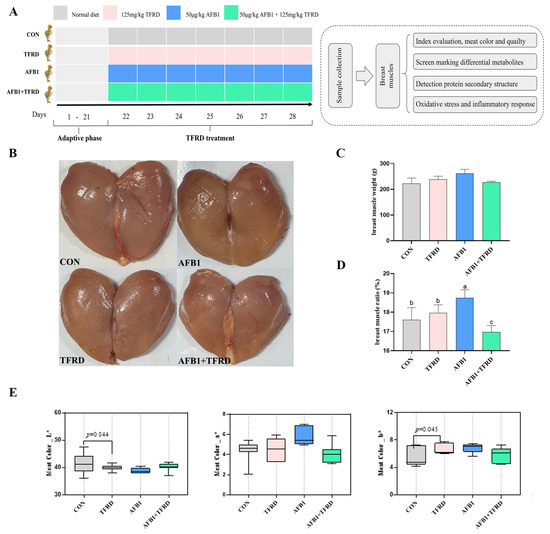 Effect of TFRD on AFB1-induced breast muscle color parameters in broilers. (A) Schematic diagram of experimental design to study the effect of TFRD on AFB1-induced breast muscle injury in broilers. (B) Representative color images of breast muscle in the CON, TFRD, AFB1, and AFB1 + TFRD groups were observed during the entire experimental period. (C,D) Relative changes in breast muscle and breast muscle ratios were recorded and analyzed over the entire experimental period. (E) The color [lightness (L*), redness (a*), and yellowness (b*)] of the breast muscles in the CON, TFRD, AFB1, and AFB1 + TFRD groups were measured and analyzed. Different letters indicate statistically significant differences (p < 0.05), and all values are presented as the means ± SD, one-way ANOVA.