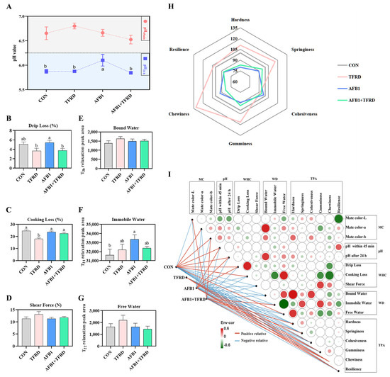 Effect of TFRD on AFB1−induced meat quality of the breast muscle in broilers. (A) Comparison of pH value of the breast muscle in the CON, TFRD, AFB1, and AFB1 + TFRD groups during the entire experimental period. (B–D) Comparison drip loss, cooking loss, and shear force of the breast muscle in the CON, TFRD, AFB1, and AFB1 + TFRD groups. (E–G) Comparison of water distribution including bound water, immobile water, and free water of the breast muscle in the CON, TFRD, AFB1, and AFB1 + TFRD groups. (H) Comparison of texture profile analysis including hardness, springiness, cohesiveness, gumminess, chewiness, and resilience of the breast muscle in the CON, TFRD, AFB1, and AFB1 + TFRD groups. (I) Pearson correlation analysis between meat quality assessment indicators. Note: The different rectangles are colored based on the Pearson correlation coefficients between meat quality assessment indicators. The intensity of color represents the degree of correlation, green represents positive correlation, red represents negative correlation. The edges indicate the correlation between breast muscle ratios and the meat quality assessment index, red for the positive correlation and blue for the negative correlation. MC: meta color, WHC: water-holding capacity, WD: water distribution, TPA: texture profile analysis. Different letters indicate statistically significant differences (p < 0.05), and all values are presented as the means ± SD, one−way ANOVA.