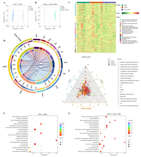Analysis of breast muscle metabolism after TFRD treatment in AFB1-exposed chickens. (A,B) OPLS-DA analysis of LC-MS/MS of broiler breast muscles, CON vs. AFB1 and AFB1 vs. AFB1 + TFRD. (C) Cluster analysis of LC-MS/MS of broiler breast muscles. (D) Metabolite abundance analysis of LC-MS/MS of broiler breast muscles. Ami, amino acid and its metabolomics; Org, organic acid and its metabolomics; GP, glycerol phospholipids; Nuc, nucleotide and its metabolomics; FA, fatty acid; Het, heterocyclic compounds; Car, carbohydrates and its metabolomics; Ben, benzene and substituted; Alc, alcohol and amines; Ald: aldehyde, ketones, esters. (E) Ternary analysis of LC-MS/MS of broiler breast muscles. The degree of concentration of the points indicates that the metabolites are evenly distributed among the three groups. The degree of dispersion of the points indicates that the metabolites differ significantly among the three groups. (F,G) Potential metabolic pathway analysis based on significantly differential metabolites in breast muscles from the CON, AFB1, and AFB1 + TFRD group broiler chickens. The degree of enrichment was analyzed by a rich factor, p-value, and the number of metabolites that were enriched in each pathway. The size of the bubble indicates the number of significant differential metabolites that are enriched in this pathway, and the point with the different gradation of color (from red to blue) represents the scope of the p-value. The larger size of each circle indicates a higher degree of enrichment, and the lower p-value represents a more significant degree of enrichment.