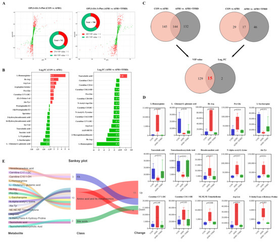 Screening of significantly differential metabolites in breast muscles after TFRD treatment in AFB1-exposed chickens by metabolomics analysis. (A) S-plot of OPLS-DA analysis of breast muscle metabolites. Significantly differential metabolites (VIP > 1) are noted as a red dot, whereas a green dot represents no significant difference in metabolites. The number of metabolites that meet the criteria (VIP > 1) is shown in a pie chart. (B) Visualization of log2-transformed read counts of differential metabolites in breast muscles between the CON vs. AFB1 and AFB1 vs. AFB1 + TFRD groups (|log2FC| ≥ ±1.5, FC stands for fold-change). (C) Venn analysis was performed by |log2FC| ≥ ±1 and VIP > 1 to screen for differential breast muscle metabolites. The overlap of the Venn diagram represents the number of differential breast muscle metabolites common to the different comparison groups. (D) The overlap of VIP values and log2(FC) in the Venn diagram indicates the number of differential metabolites shared between groups. Statistical analysis was performed for metabolites that differed between groups; p < 0.05 indicates statistical significance between the two variables, and all values are expressed as mean ± SD with one-way ANOVA. (E) Sankey plots depict the class and trends of marker differential metabolites in the AFB1 group of breast muscles.