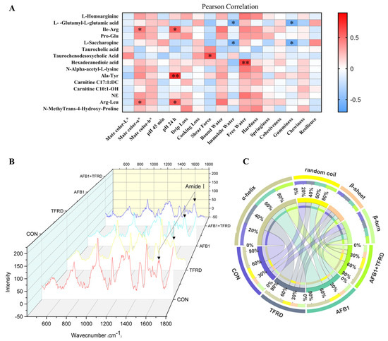 Effects of TFRD on the AFB1-induced protein secondary structure of myofibrillar breast muscle in broilers. (A) Pearson correlation analysis between the significantly differential metabolites and indicators of meat quality in breast muscle. Note: The different rectangles are colored based on the Pearson correlation coefficients between the significantly differential metabolites and indicators of meat quality in breast muscle. The intensity of color represents the degree of correlation; blue represents positive correlation, red represents negative correlation. The asterisks indicate statistically significant differences and correspond to p < 0.05 (*) and p < 0.01 (**). A p-value higher than 0.05 represents not statistically significant. (B) Raman spectroscopy of breast muscle of broiler chicken at a wavenumber of 400–1800 cm−1. (C) The abundance analysis of the protein secondary structure of myofibrillar in breast muscle includes ɑ-helix, random coil, β-sheet, and β-turn.