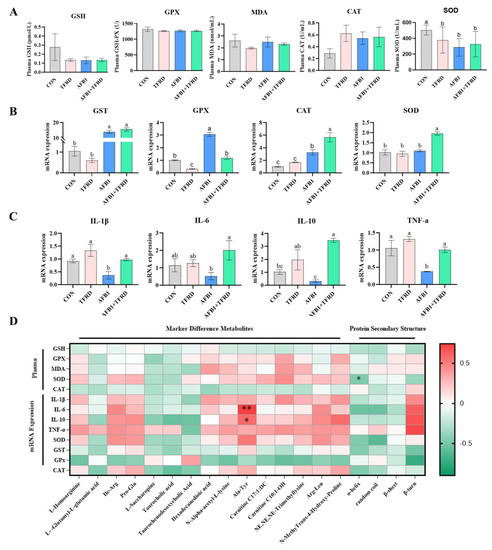 Effect of TFRD on AFB1-induced oxidative stress and inflammatory damage of the breast muscle in broilers. (A) Plasma antioxidant enzyme levels, including GSH, GPX, CAT, T-SOD, and MDA. (B) The relative mRNA expressions of oxidative stress-related genes SOD, GST, GPX, and CAT. (C) The relative mRNA expressions of inflammation-related genes IL-1β, IL-6, IL-10, and TNF-ɑ. (D) Pearson correlation analysis between indicators related to oxidative stress and inflammatory response with the significantly differential metabolites and the protein secondary structure of myofibrillar in breast muscle. Note: The different rectangles are colored based on the Pearson correlation coefficients between meat quality assessment indicators. The intensity of color represents the degree of correlation, green represents positive correlation, red represents negative correlation. The asterisks indicate statistically significant differences and correspond to p < 0.05 (*) and p < 0.01 (**). Different letters indicate statistically significant differences (p < 0.05), p-value higher than 0.05 represents not statistically significant.