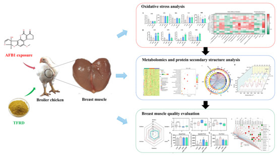 Therefore, this study further explored whether TFRD as a feed additive could alleviate the deterioration of breast muscle meat quality caused by AFB1 exposure by examining sensory and physical changes in breast muscle, changes in breast muscle metabolite levels, changes in protein secondary structure of myofibrillar, and assessment of inflammatory responses and oxidative damage in breast muscle.