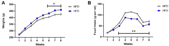 Body weights and food intake in NPD and HFD experimental groups for 8 weeks (T1) of HFD diet. (A) Weights. Body weight gains (g) difference between NPD and HFD groups in 8 weeks of HFD. (B) Food intake. Food intake (g per cage) difference in NPD and HFD groups in 8 weeks of HFD. Statistical significance indicated for (*) p < 0.05 and (**) p < 0.001.