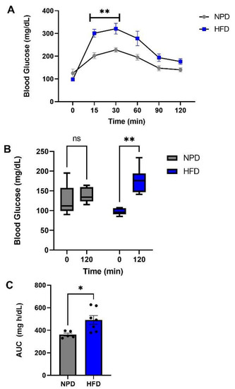 GTT test in NPD and HFD experimental groups after 8 weeks (T1) of HFD. (A) Glucose levels in GTT. Plasma glucose levels (mg/dL) differences between NPD and HFD groups for different times of GTT. (B) Glucose levels at 120 min. Plasma glucose levels (mg/dL) differences between NPD and HFD groups until 120 min after injection. (C) Area under the curve (AUC). Plasma glucose levels (mg/dL) per unit of time (h) difference between NPD and HFD groups. Statistical significance indicated for (*) p < 0.05 and (**) p < 0.01.
