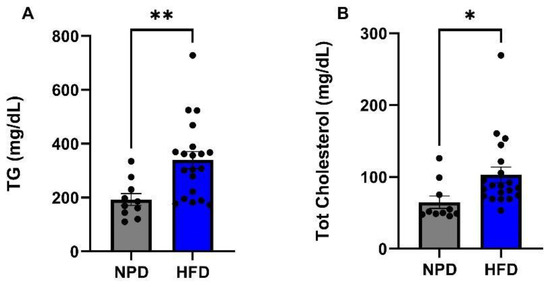 Lipid profile in NPD and HFD experimental groups after 8 weeks (T1) of HFD. (A) Triglycerides (TG). Plasma TG levels (mg/dL) differences between NPD and HFD groups after 8 weeks of HFD. (B) Total cholesterol. Plasma total cholesterol levels (mg/dL) differences between NPD and HFD groups after 8 weeks of HFD. Statistical significance indicated for (*) p < 0.05 and (**) p < 0.01.