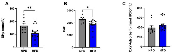Antioxidant status in NPD and HDF experimental groups after 8 weeks (T1) of HFD. (A) SHp Test. Thiols groups levels (mmol/L) difference between NPD and HFD groups after 8 weeks of HFD. (B) BAP Test. Biological antioxidant potential levels (mmol/L) difference between NPD and HFD groups after 8 weeks of HFD. (C) OXY-Adsorbent Test. The antioxidant power of the plasma barrier levels (mmol HClO/mL) difference between NPD and HFD groups after 8 weeks of HFD. Statistical significance indicated for (*) p < 0.05 and (**) p < 0.01.