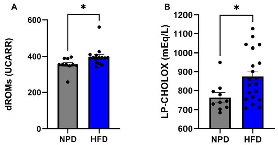 Pro-oxidant status in NPD and HFD experimental groups after 8 weeks (T1) of HFD. (A) dROMs Test. Differences in ROMs (primarily hydroperoxides) levels (UCARR) between NPD and HFD groups after 8 weeks of HFD. (B) LP-CHOLOX Test. Differences in LP-CHOLOX (lipoperoxides and oxidized cholesterol) levels (mEq/L) between NPD and HFD groups after 8 weeks of HFD. Statistical significance for (*) p < 0.05.