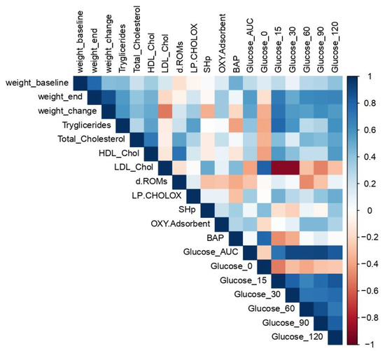 Correlation matrix of measured variables. Heat maps representing Spearman correlation matrices between biochemical and body weight variables. Missing values were handled with ‘pairwise complete observation’.
