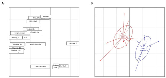 PCA was carried out on the centered and scaled data of biochemical and redox homeostasis variables in MetS (Figure 8). The first two principal components (PCs) together account for 52.33% of the variance in the data (PC1 = 35.58% and PC2 = 16.75%). A significant separation between the two experimental groups can be seen along PC1 thanks to a one-way ANOVA and post-hoc test (F(1,16) = 17.93, p = 0.0006). Furthermore, non-significant differences emerged between groups along PC2 by a one-way ANOVA followed by a post-hoc test (F(1,16) = 3.52, p = 0.078). The separation between groups along PC1 can be attributed not only to the variation in MetS of parameters related to glucose tolerance, to body weight gain and lipid homeostasis, but also to the redox homeostasis biomarkers analyzed in the present study. In particular, we can observe in Figure 8A that redox homeostasis parameters like dROMS test are strictly correlated with lipid profile biomarkers forming a cluster that in turn negatively correlates with the cluster formed by SHp and BAP.