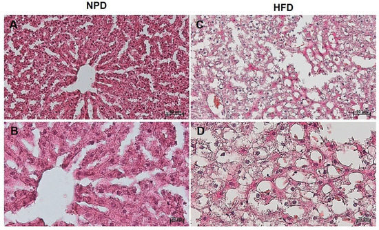 Histological features of liver tissue of NPD and HFD groups. Representative images of hematoxylin and eosin staining of liver tissue (A,B: NPD; C,D: HFD). (A,C): magnification 200×, scale bar 50 µm. (B,D): magnification 400×, scale bar 20 µm.