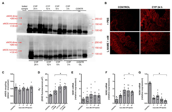 Temporal changes in endothelial nitric oxide synthase (eNOS) expression (A) and functional eNOS coupling (B) in bladder lysates from the control (saline) and cyclophosphamide (CYP; 300 mg/Kg, ip)-injected animals. The bladder samples were processed in non-denaturing conditions (low temperature electrophoresis) to analyze structural coupling (dimers to monomers ratio; (C)). A boiled sample was used as a monomer control. The densitometry was calculated by ImageLab (Biorad, Hercules, CA, USA). A dihydroethidium (DHE) assay was performed in the bladders from CTRL and the 24 h CYP-injected animals, pre-incubated or not with non-selective eNOS inhibitor L-NAME (1 mM, 30 min). The fluorescence intensity was quantified using ImageJ (D). The temporal changes in mRNA expression levels of NOX1 (E), NOX2 (F), and NOX4 (G) were evaluated by RT-PCR and expressed as relative to the housekeeping genes. Summary data (mean ± SEM) represent n = 4–6 for each group/time point. Significance was tested by one-way ANOVA followed by multiple comparisons by Tukey’s post-hoc test. * p < 0.05 vs. CONTROL.
