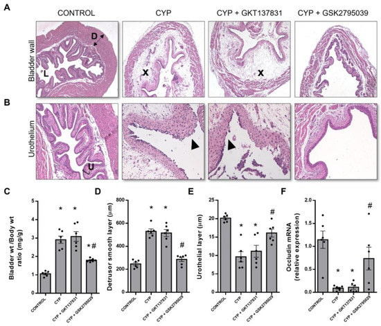 Histopathological evaluation of the bladder showed alterations after CYP injection (Figure 3A,B) characterized by submucosal edema. This was also evidenced by the increase in bladder weight/body weight ratio (Figure 3C, p < 0.05 vs. the control), and muscularis edema and disorganization, which leads to an increase in the detrusor smooth muscle layer (Figure 3D; p < 0.05 vs. the control). Mucosal abrasion evidenced by thinning of the urothelial layer was also observed in the CYP group (Figure 3E, p < 0.05 vs. the control). Treatment with GKT137831 did not attenuate any of these CYP-induced changes (Figure 3A–E). In contrast, GSK2795039 treatment was highly effective in attenuating CYP-induced cystitis, as demonstrated by the significant reductions in the submucosal and muscularis edema (Figure 3A) in CYP + GSK2795039 in relation to CYP (Figure 3A), even though the bladder weight ratio was still higher than the controls (p < 0.05, Figure 3C). More importantly, the urothelium of the CYP + GSK2795039-treated animals remained almost intact (Figure 3B,E), although a few areas of urothelial abrasion are revealed. Additionally, CYP drastically reduced the mRNA expression of the tight junction protein occludin (Figure 3F, p < 0.05 vs. the control), which was unaffected by GKT137831 treatment, but markedly attenuated by GSK279539 (p < 0.05 vs. CYP).