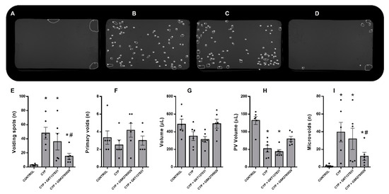 Void spot filter papers imaged under UV light (A–D). Automated spot detection of the control (saline) and cyclophosphamide (CYP, 300 mg/Kg, ip, 24 h)-injected animals untreated or treated (three doses in 24 h) with the NOX1/4 inhibitor GKT137831 (5 mg/Kg, ip) or NOX2 inhibitor GSK2795039 (5 mg/Kg, ip). The number of voiding spots (E), the number of primary voids (PV; greater than 20 μL; (F)), the total volume (G), the PV volume (H), and the number of microvoids ((I); less than 20 μL and greater than 2 μL). Summary data (mean ± SEM) represent n = 6 for all of the groups. Significance was tested by two-way ANOVA followed by multiple comparisons by Tukey’s post-hoc test. * p < 0.05 vs. CONTROL; # p < 0.05 vs. CYP.