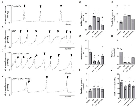 We next examined the urodynamic characteristics by cystometry under animal anesthesia. Figure 5A–D shows representative cystometry tracings of mice from four groups, showing the intravesical pressure changes following 45 min of continuous filling (0.6 mL/h). In relation to the controls (Figure 5A), CYP-injected mice (Figure 5B) displayed irregular micturition patterns characterized by significant increases in voiding frequency (Figure 5E), as the intervals between voiding shortened, and threshold pressure (Figure 5F), as the intravesical pressures increased proportionately with filling rate, both of which were accompanied by reductions in bladder capacity (Figure 5G) and compliance (Figure 5H). No changes were observed for baseline (Figure 5I) or peak pressures (Figure 5J). Similarly to the VSA tests, treatment with GKT137831 (Figure 5C) had no effect in any of these CYP-induced urodynamic alterations, but GSK2795039 significantly attenuated all CYP-induced voiding alterations (Figure 5D).