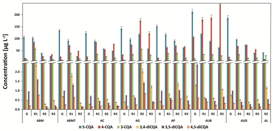 Chlorogenic acid (caffeoylquinic acids isomers—CQA) content in Arabica coffee brews. Legend: G—green coffee beans; R1—light-roasted coffee beans; R2—medium-roasted coffee beans; R3—dark-roasted; AL—Arabica Kopi Luwak; 5-CQA—5-O-caffeoylquinic acid; 4-CQA—4-O-caffeoylquinic acid; 3-CQA—3-O-caffeoylquinic acid; 3,4-diCQA—3,4-dicaffeoylquinic acid; 3,5-diCQA—3,5-dicaffeoylquinic acid; 4,5-diCQA—4,5-dicaffeoylquinic acid. Detailed information about the coffees can be found in Table 1.