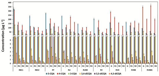 The six isomers of the caffeoylquinic acids in all coffee brews were determined, and the dominant acid was 5-O-caffeoylquinic acid, followed by 4-O-caffeoylquinic acid and 3-O-caffeoylquinic acid (Figure 1 and Figure 2). 4,5-dicaffeoylquinic acid, 3,5-dicaffeoylquinic acid, and 3,4-dicaffeoylquinic acid were also found in all analyzed coffees. 5-CQA was the main compound in all green unprocessed beans (from 72% to 83% in the Arabica coffees and from 41 to 80% in the Robusta coffees of the total analyzed CGAs), and the amount of this compound decreased after light roasting. In medium-roasted coffees, the levels of other isomers increased, especially 4-CQA, and in dark-roasted coffees, they usually decreased (Figure 1 and Figure 2). The lowest levels of 5-CQA and other isomers as well as the total analyzed CGAs were found in most of the dark-roasted coffees.