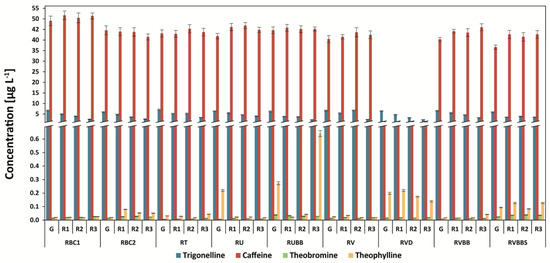 The level of theophylline in Arabica coffees was the highest for Kopi Luwak (0.044 mg g−1) in comparison to the washed coffees (from 0.001 mg g−1 for Uganda Bugishu to 0.012 mg g−1 for Uganda Drugar) and higher than the concentration of theobromine (Figure 3 and Figure 4). On the other hand, the concentrations of theophylline in other Arabica coffees were considerably lower than those of theobromine. In Robusta coffees, the green coffee brews RVBB and RUBB showed the highest content of the compound—even higher than that of theobromine (Figure 4). The steaming of coffee increased the level of theobromine in the RVBB green coffee brew from 0.0089 mg g−1 to 0.0235 mg g−1 (2.6-fold higher), and in steamed and roasted coffee, it was 0.038 mg g−1. The decaffeination process decreased the level of theophylline, on average, by 10-fold but did not change the amount of theobromine.