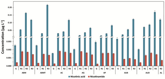 Nicotinic acid (with trigonelline) is usually determined between other compounds such as sucrose or chlorogenic acids with the use of HPLC or LC-MS [15,31]. The analysis of nicotinamide in coffees is rather rare [7,29]. Perrone et al. [15] found that the amount of nicotinic acid in green coffee beans was below the limit of detection and achieved an LOD = 15.5 ng mL−1 in comparison to that of our results (0.06 ng mL−1) (Supplementary Table S2). We recently found that Arabica and Robusta green coffee brews contain nicotinic acid at similar levels, from 3.20 to 4.81 μg g−1 and from 4.01 to 6.72 μg g−1, respectively, depending on the coffee origin. This is also true of nicotinamide—from 0.31 to 0.88 μg g−1 and from 0.30 to 1.66 μg g−1, respectively [7]—and similar levels were also found in other studies [15,29,32]. After the light roasting process, the level of NA increased in Arabica coffees from 4.7-fold to 23.1-fold, and in Robusta coffees, it increased from 3.3-fold to 1.8-fold. NAM changed in Arabica coffees from 1.5-fold to 4.1-fold, and in Robusta coffees, it changed from 1.1-fold to 3.2-fold [7].