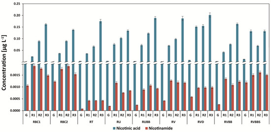 3.3. Determination of Nicotinic Acid and Nicotinamide