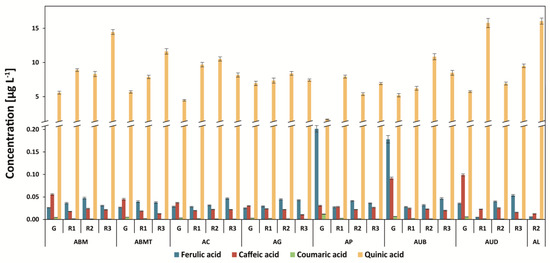 The highest amounts of ferulic acid and caffeic acid were found in the Tanzanian Robusta coffee brew: 0.548 mg g−1 and 0.242 mg g−1, respectively (Figure 8). A similar level of caffeic acid was determined in the green beans of Uganda Robusta Black Beans coffee: 0.249 mg g−1. The roasting process decreased this compound, especially at the third degree, inversely to quinic acid.