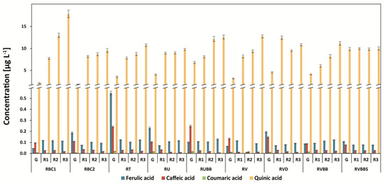 The decaffeination process increased the level of ferulic acid (3.1-fold) and quinic acid (1.5-fold) for green coffee beans (Figure 8). This process did not influence the p-coumaric acid content. For steamed coffee, the level of p-coumaric acid was lower by 4.7-fold (RVBBS) in comparison to RVBB green coffee beans.