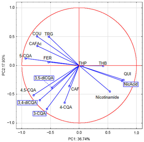 Principal Component Analysis—Projection of variables (TRG—trigonelline; COU—coumaric acid; CAFAc—caffeic acid; 5-CQA—5-O-caffeoylquinic acid; FER—ferulic acid; 3,5-diCQA—3,5-dicaffeoylquinic acid; 4,5-diCQA—4,5-dicaffeoylquinic acid; 3,4-diCQA—3,4-dicaffeoylquinic acid; 3-CQA—3-O-caffeoylquinic acid; CAF—caffeine; 4-CQA—4-O-caffeoylquinic acid; Nicotinamide, NicAcid—nicotinic acid; QUI—quinic acid; THP—theophylline; THB—theobromine).