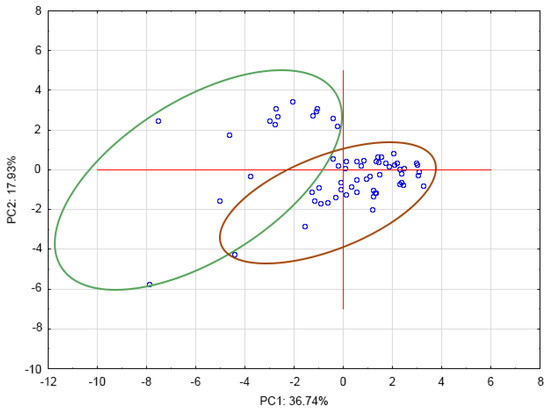 Principal Component Analysis: PC1 × PC2–clusters (the green oval represents green coffee samples and the brown oval represents all processed coffees: roasted–light, medium and dark, steamed, decaffeinated, black beans Robusta and Arabica Kopi Luwak samples).